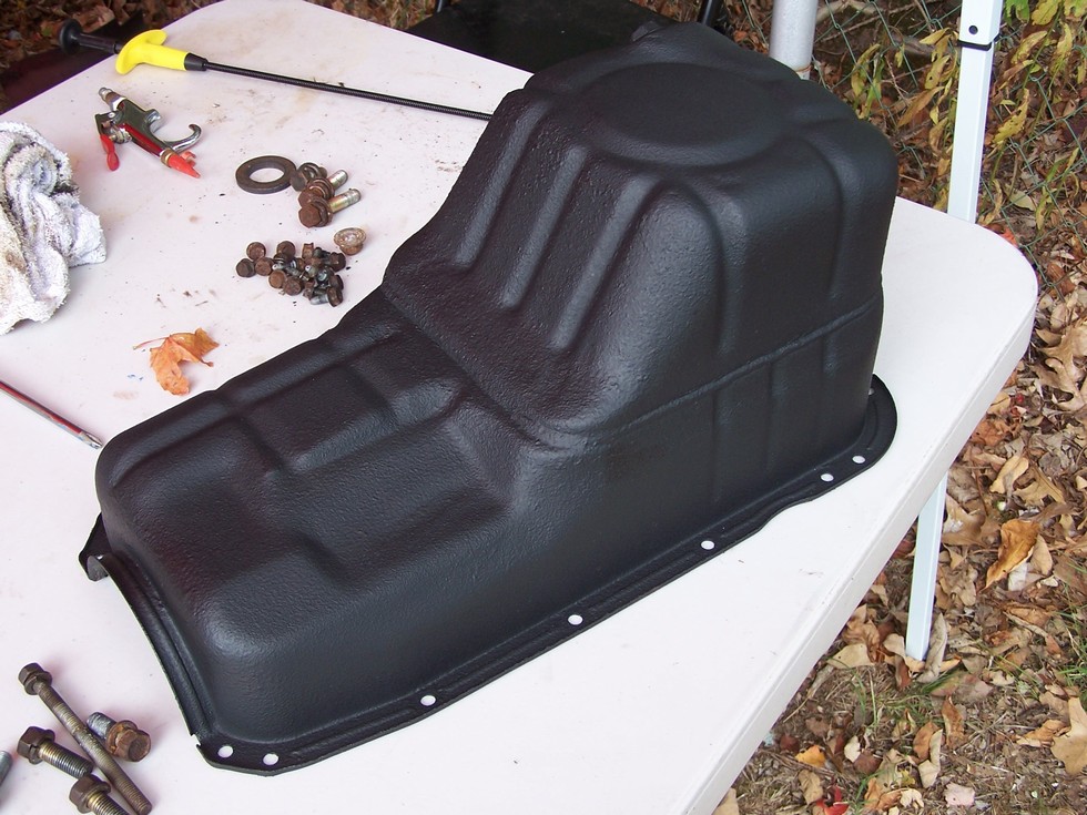 oil pan ready , resealed and paint..... thats enough work for 1 weekend, need shower.......