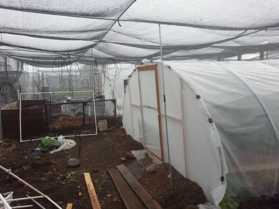 Mother Nature was not please that DeanAZ and I are trying to outsmart her with tunnels, as soon as I started to close up tunnel 2, the temp dropped from 60f to 50f, the wind kicked to 26mph, and the rain started...too bad the rain doesn't hit the plant....good thing the wind doesn't hit the plant. Threw a tarp over the shade screen-covered "back office" to keep 1622 tip dry. Kinda cool temp, who knows if they'll take....
