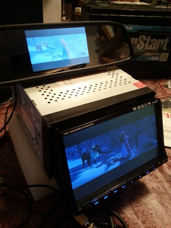 testing the new double din radio, and the rearview mirror with lcd screen for movies and the back up camera.. oh the fun with wires......