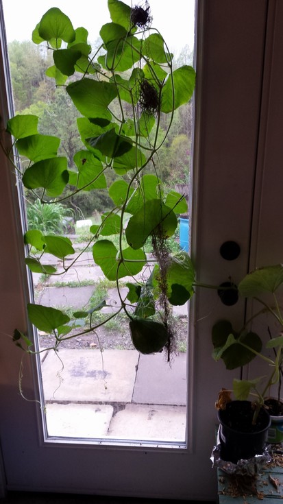 my best bushel gourd X long gourd cross. Seeds should be ready in time to plant. Its growing in a very small pot, that was transplanted from a McDonalds cup ! LOL