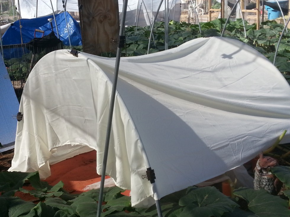 Ok, Sorry Team Pumpkin SW Division has been in sleeper mode. Here is the 923 Gerhardts new digs, the foamboard roof has been rising so it was time for a new cover. We have been struggling to get decent weight gains, and I've been embarrassed to post lame picture gains. As of this week the patch has been changed from full coverage of 70% shade to 30% shade on east half and 70% shade on west half. I think we were too aggressive with shade...live and learn