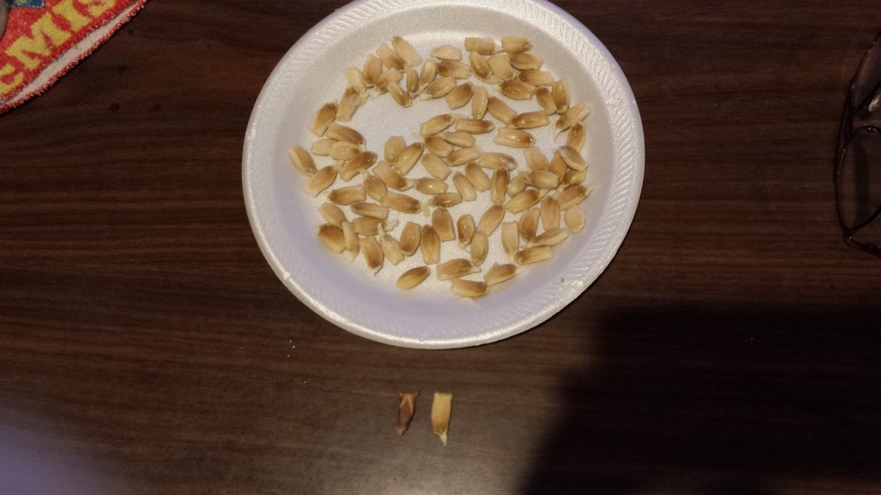85 seeds ! They look pretty good. There is a 270 Bushel gourd seed at the bottom of the plate for comparison. Not too bad for a little fruit. Full size seeds. I'll let them dry and see if the will sprout. Its the 270 kent Bushel gourd X the 124 young long gourd