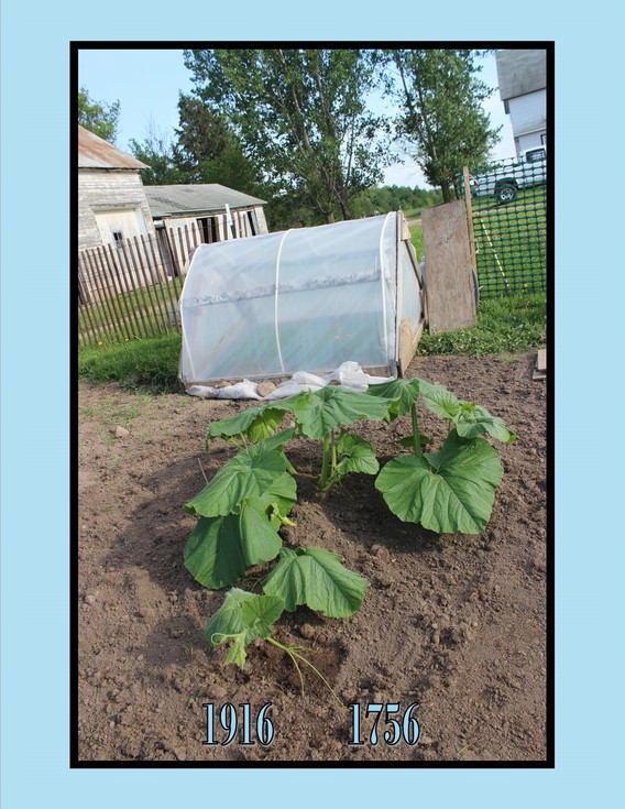 The Great Outdoors! It was a little too windy today and it will be a little too stormy tomorrow but the 1916 was begging to get out. Two side vines in a row on the same side, if you look close you can see the one wants to grow straight up in the air. I will unbury some of the main once the sides take off, get less perky and throw down some roots. 1916 is the winner here over 4 feet long.