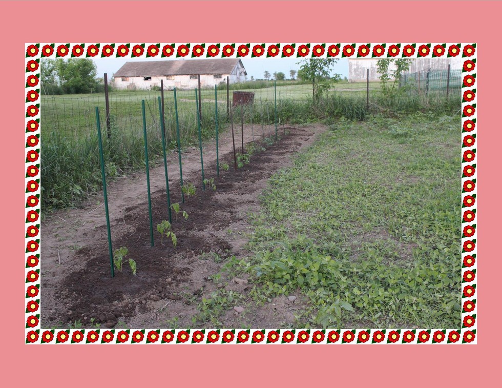LL's Tomatoes ... in the ground ... FINALLY. Six competition and 7 eating. I buried them deep and loaded 'em up with all the stuff. Those weeds should be dying soon.