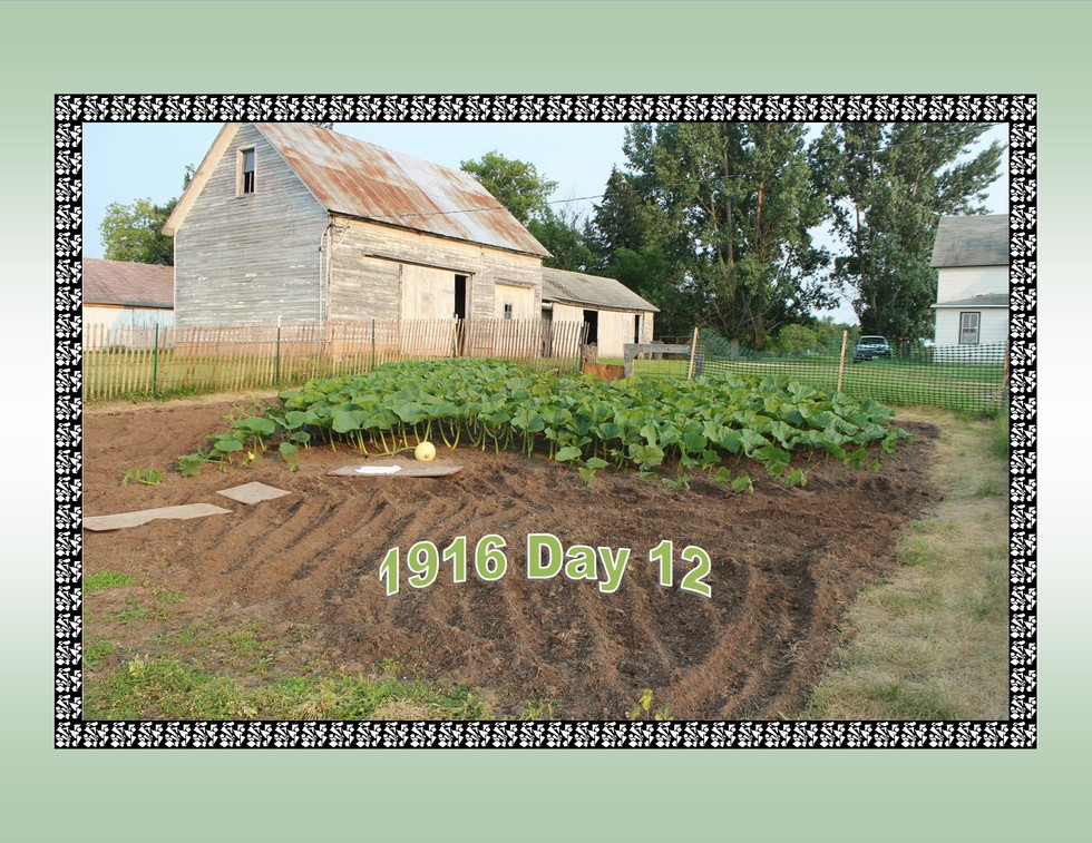 After at least five continuous hours of this growing areas work ... committed on the 1916 first set, culled the second set, still have the third. Included vine buries, terminations, elimination of unneeded male flowers (sorry guys), tilling again as this is the new spot (I have quite the rock quarry now), rigging up the new gate and hauling the pumpkin litter to the fire pit to burn. Two of the five plants beckon me for the same treatment.