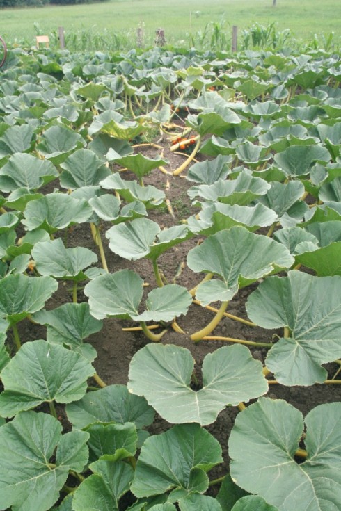 This is a view along the main vine of my 1495 Stelts plant and I have noticed that this year I have significantly less weeds than in previous years. So what have I done this year?: As long as the plants were small I have pulled all of the weeds around the plants (even the smallest seedlings) and I have covered an area of about 4.5 x 7 ft with a thin layer of peat. After a couple of days I have again removed weeds (the few seedlings which had enough power to break through the peat surface), and then the germination of weed seeds seemed to have stopped. Now the areas with most weeds can be found around the leaf nodes, where I had added some soil from my patch. Next year I will probably use some peat based potting soil for burying the leaf nodes.