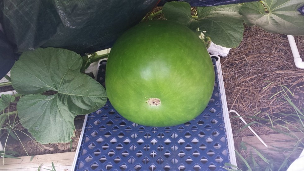270 kent bushel gourd. I'm just not happy with the growth. Maybe i should have done ____ Just don't know. Looks nice, but slow... so i cut it off. Got 1 more set for another try. It will be my keeper as everything is deadheaded. Go big or be a decoration ! LOL