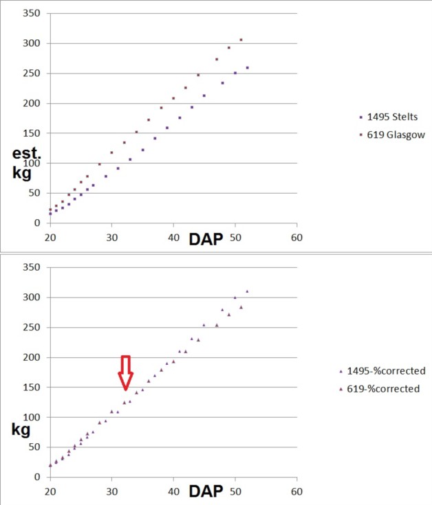 The 1495 Stelts produced my heaviest (new PB) pumpkin this year, the 619 Glasgow produced my biggest pumpkin this year (but 798 lbs only), which was quite disappointing, because I thought the 619 would produce my new PB. The growth curve (derived from OTT measurements) was much better for the 619. Now the big question is, what is the potential in the seeds of my 1495 x 619 and 619 x 1495 crosses? The 2nd picture shows the "true" weight gains (I have multiplied the OTT derived weights with 1.14 for the 1495 (it went 14% heavy) and with 0.88 for the 619 (because it went 12% light). The new curves are quite interesting. Until 35 DAP the 619 might have been ahead of the 1495 with the true weight gains! So what made the curves cross around 35 DAP? There was an event around 35 DAP which caused severe damage to the 619 plant, this event was the combination of dry soil and the very thirsty 619 plant itself. Suddenly the leaves of this plant started to dry and to die. After some decent watering (and, in order to be on the safe side, an Aliette drench as well) this process stopped and the growth curve of the 619 fruit did continue "as usual", just at somewhat decelerated speed because of the 30 - 40 % leaf surface the plant had lost. In summary: Grower error, the 619 could have produced another 1000+ lbs fruit (probably, but who knows?).