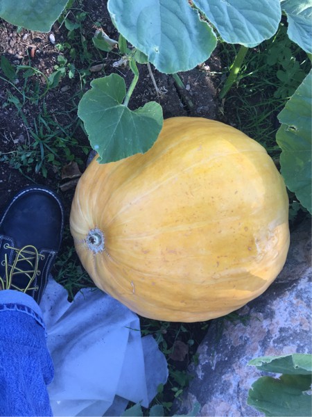 This is the oddball fruit that was on the hail damaged vine. I have no clue how it ended up being my biggest pumpkin. I did start using my chickens manure to make a tea. Seems to have helped as growth over the last week has been awesome. My Bonnie plant is running down the rock wall and a few females are growing on the rocks. I'm going to let them go for now but if they pack on some weight I will cut them before they roll down the street.