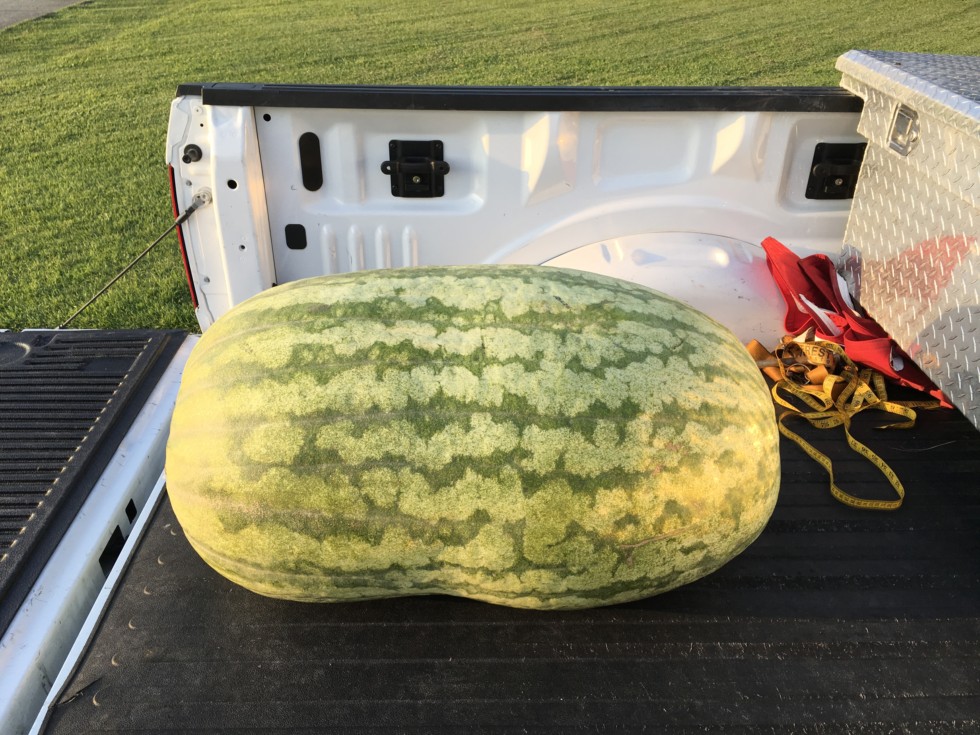 Rolled this 115 plus day old Melon to take to Elkin NC tomorrow and found a brown spot on the bottom. Took it to scales to weigh, and it was 248lbs. It only measured 201", and should have weighed 225lbs. Think I will keep this seed. I like the ribs on this melon.