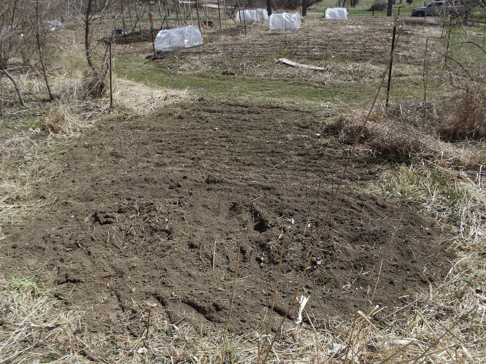 Start of the bushel gourd patch. It is at the bottom of a slope, and has accumulated soil washed down on it for years. This hasn't been plowed up for the 32 years we have owned the acreage, and it may have been in grass for decades before that. I first hit the sod with the mini tiller, turn it over with the fork, and till it again. I put 1 cubic foot of potting soil at each plant site. I got the potting soil on clearance for about $0.75 a bag at the end of 2016. The closest hoop house is in a risky spot. If we get too much rain it could get flooded. It will be our attempt at a blossom down pumpkin.