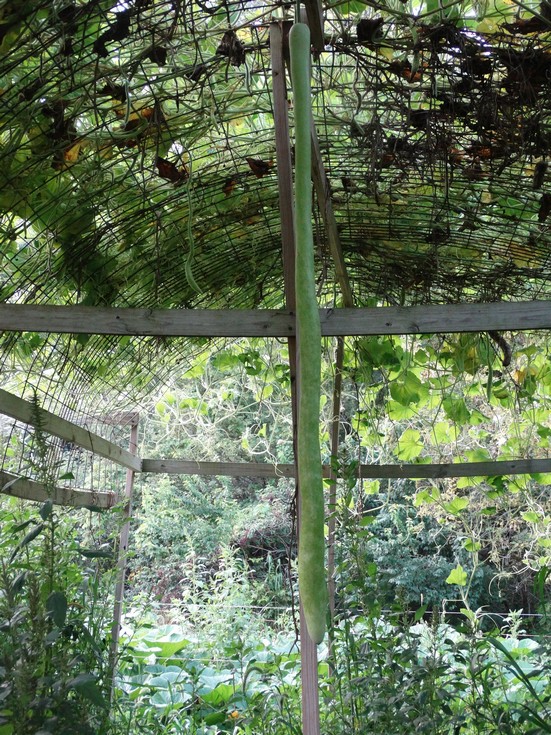 Long gourd is growing well, about 7' long now. I need to start pushing it so it reaches the ground. Trellis is 12' high. Growing from my 129 McWilliams seed.