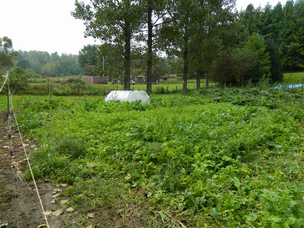 Why is a hoop house going up in the end of August? My daughter and I plan to grow a pumpkin for the Iowa state Fair, early August competition. We can't get heat cables in that far from the house to warm the soil. so This is the next best. This plot has space to give 2 plants 820 sq ft. The ends were mustard, tilled in planted to rape and radish. The middle was sweet corn, now mustard. I mowed and tilled the rape/radish like a mustard crop. The hoop will heat the soil. In October I will fill it with leaves and grass to prevent deep frost. I will start this week with leaves and grass around the outside of the hoop. The hoop will stay up over winter. Hopefully we will have warm soil for an early start next year.