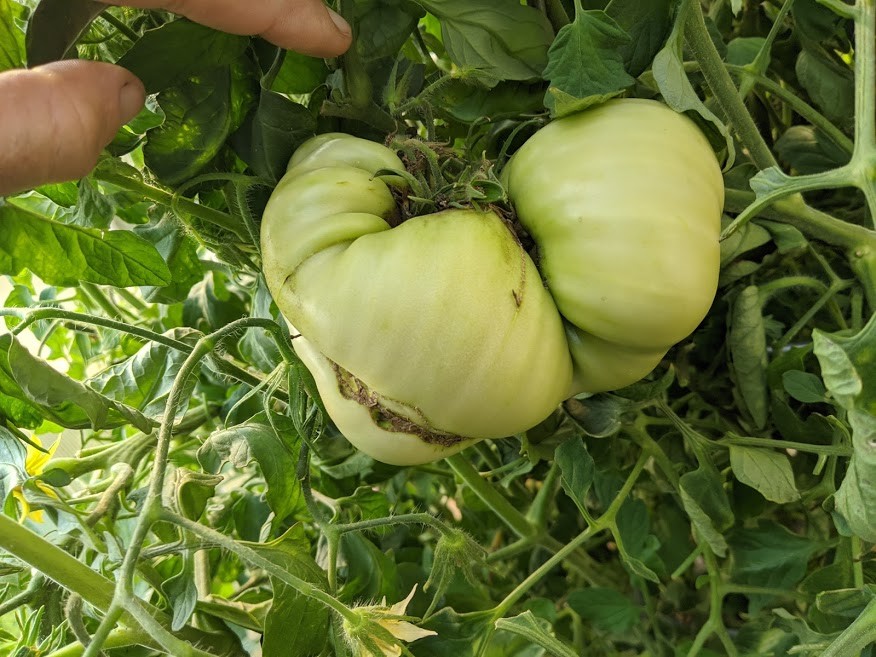 Have three tomatoes on the bucket plant all roughly the same size. About time to make a decision and start culling. All have the overall shape of a double although they are more than a double blossom. All have slightly different shapes. First has one normal blossom half and the other half caterpillar shape.