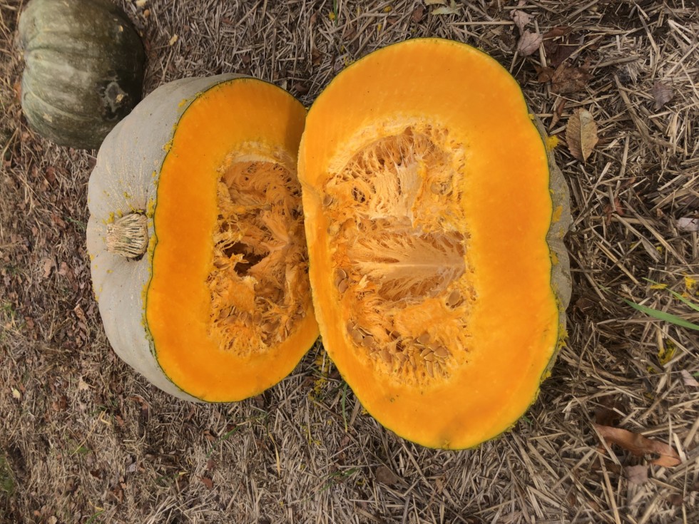 This squash weighed approximately 100 lbs and is the offspring from a cross made- 675 Maydan* x blue moon. Two of the made it to maturity. This one too on the characteristics of a very large blue moon while the other retained a dark green quash color.
