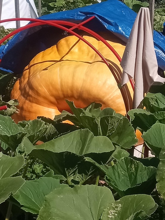 2080 Lopresti has outgrown the shelter again! It's a beast of a pumpkin! Beautiful orange shiney skin. 31 more days until the weigh off!