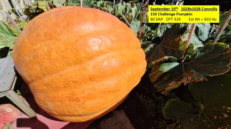 Our 150 Challenge Pumpkin is still chugging along with at 4 lbs/day. Est Wt = 833 lbs per new GPC chart.