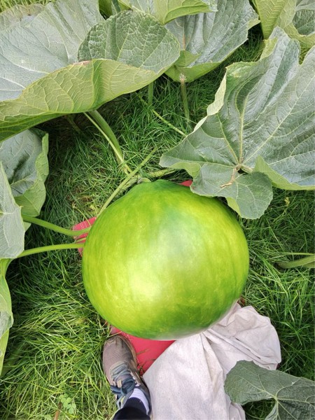 Nice Bushel gourd growing. This is at 30 DAP. Probably around 100 pounds. Grown from the 313 Trombley so it has great genetic potential just not sure if time is on my side for full potential