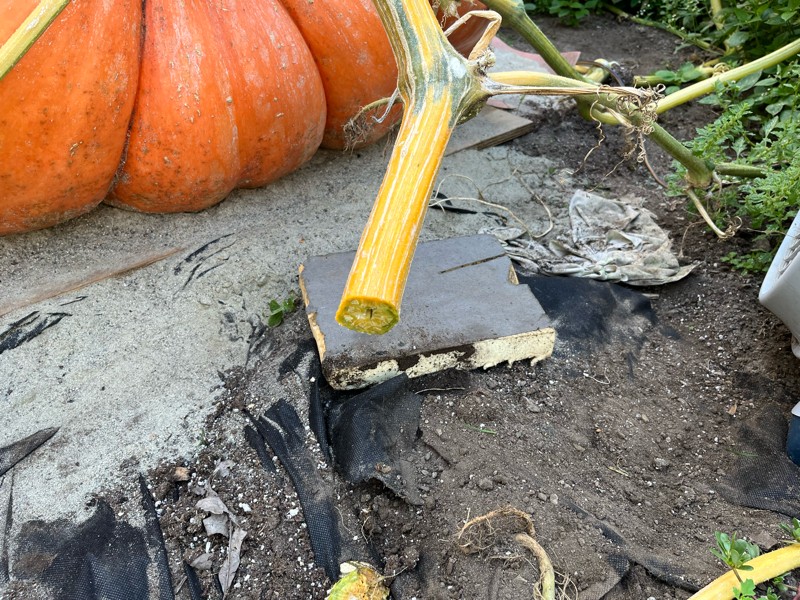 Well, I lost the main vine. Rot started in the vine at a leaf node and was traveling down the vine towards the pumpkin. I cut it and kept cutting more off until it was clean. Then we treated the cut vine and put a fan on it.