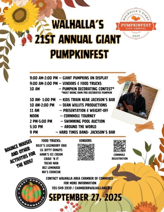 Walhalla ND 21st Annual pumpkin festival Saturday 27 September I personally don't have an entry, I've been dealing with hip issues for over a year now. I finally recently had a complete left hip replacement. And I'm looking forward to getting back into the game