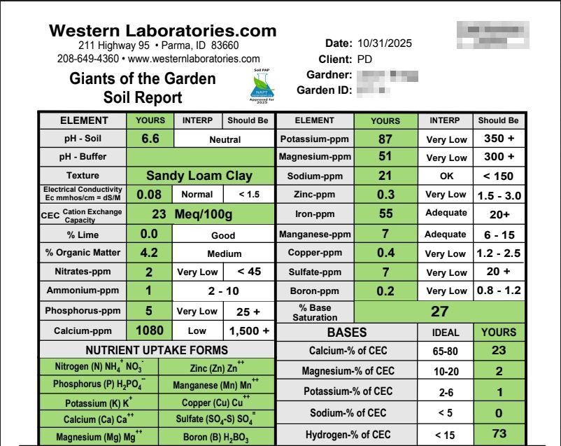 Got my soil sample back from a different patch. This one is several miles from my main patches. I'm really happy with the pH... I should probably note that this patch has never been amended or grown in before...