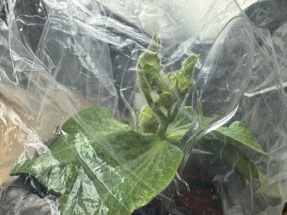 Couple more of my test seedlings. Little different setup. Bag over them for humidity and a plastic spoon to help keep them from falling over.. Moving to my grow room at home so they don't get MORE leggy...
