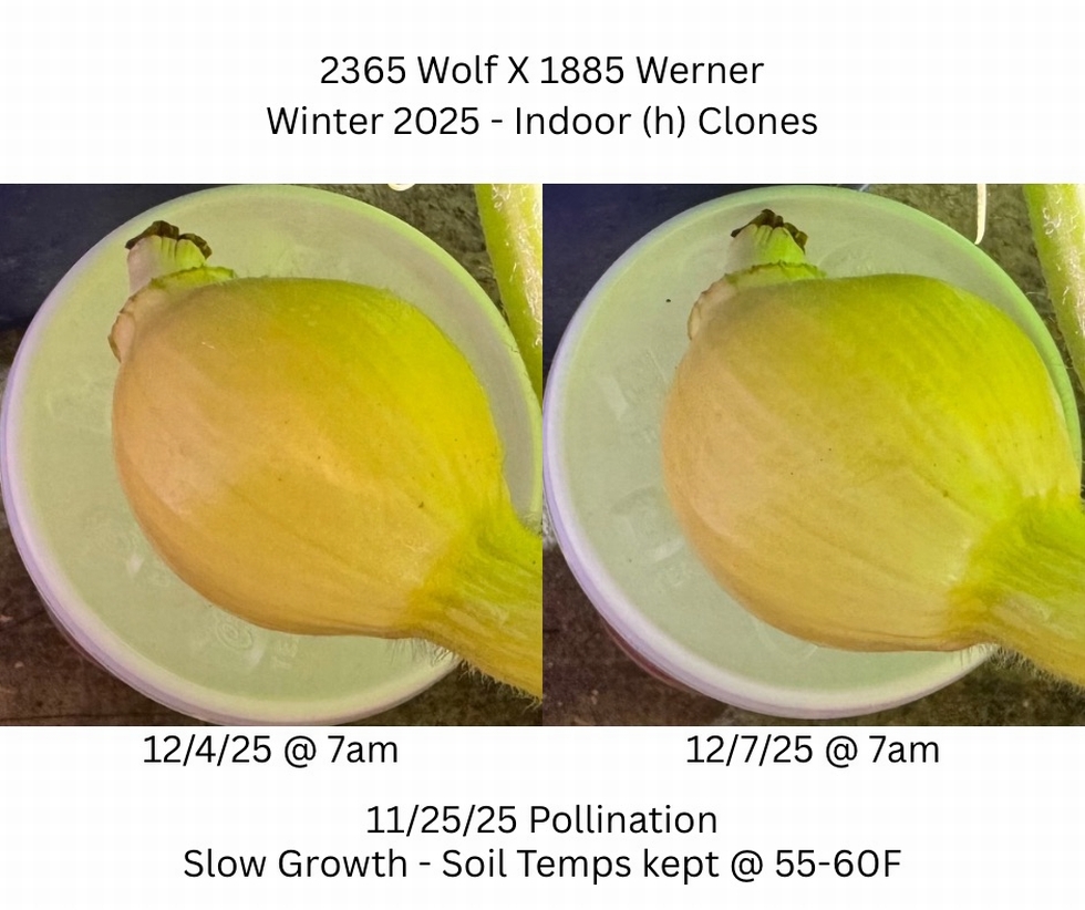 My indoor winter clone project is still growing! Very slow, but I still see growth! I think I will increase the soil temp and see if that speeds up the fruit growth some. I don't want it to grow two fast though. It's on a very small vine, so that'll probably limit growth also. If it doesn't abort, my goal is to get it to the point of mature seeds. Mother clone is a 2365 Wolf and male pollinator clone is an 1885 Werner. Seeds I'll plant, if I get any... But then comes the question, does seed size mater, so long as they are viable?