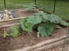 Noticed a few leaves on both plants with some wilting/drying up areas around the edges. Worried it might be a disease (a few cucumber beetles had been spotted the last few days), but it turned out to likely be sun or heat scorch on a few young leaves (all about 8-10" size leaves) that were hit with a sunny 85F day after lots of cool cloudy weather. I've been spraying the whole plants about 1x per week with Spectracide permethrin/immunox insecticide/fungicide.