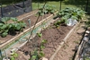The patch as of today. Two 1526 Millers at opposite ends of the bed on the left, one 656 Domke in the bed on the right. The Millers are about 2 weeks behind the Domke. Beds are 24'x4' with another 4' growing area to the left of the left bed. Basically there is about 240 square feet of space where vines can be buried and take root, but lots of additional grass areas where I will likely let the main plant grow to some extent (and I might try to bury some secondary vines in mulch in these areas). Strong storm blew through this evening and broke off two feet of the main vine of the smaller Miller (front left side) and slightly uprooted the ends of a few secondaries. I do have some wind screening up, but not enough).