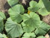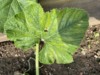 This is the result of transplanting a couple of germinated seeds into a barn swallow next filled with soil. The weave of the nest along with the dried droppings in the nest proved to be to much for the plant roots to penetrate. Also, the soil inside the nest retained far more moisture than the soil outside and underneath it. So, though the plants were both green and the first two leaves seemed to be normal, the root system was to wet and not very substantial. All considered, I probably wouldn't plant pumpkins in a swallows nest.