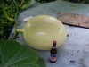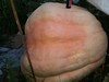 Bertha on the 679 day 30. the 679 is a 1495 x self means this one has a lot of the 1161 in it...lol.....sucked in blossom.....this one is more extreme than any i have grown and am curious to watch how she plays it out long term. i had to lay on my back with a knife in hand and reach into the area and delicately cut the prodruding blossom nub from pushing into the side wall of the pumpkin and treat it with captan. a good six pack gave me the steady nerve and confidence and all went well as can be seen in next pic.
