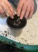 Step three - drop the peat pellet and sad looking plant in, push a little dirt around it. This works well for the next transplant stage. Just use the present pot as your mold instead of a little jar.