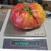 This estimate is at least 1/2 pound heavier than reality, however, since this tomato has a LOT of lobing and crevices which cannot be accounted for by the weight estimate formula. Still has a decent shot of breaking 4 lbs.