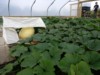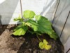 The first female flower spotted today about 6ft out on the 1949 main vine. We got the plastic sheeting on the polytunnel today and the difference in warmth inside/outside is immediate. No wind inside either, which means no battered leaves and stems. There is plenty of ventilation though with double doors each end and both the sides roll up 1m if necessary. Now I can get to work on the soil and after that the drip lines can go down.