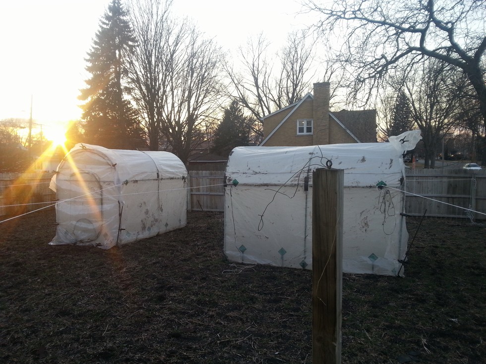 frost is gone....snow is gone....greenhouses up to warm and dry soil in planting spots....next step when soil dries inside greehouses is to put in soil warming cables. my old greenhouses have broken zippers on door entrances so the visqueen and clamps seal in the heat. greenhouses are now 10 years old....nice. 2014...dreaming big.