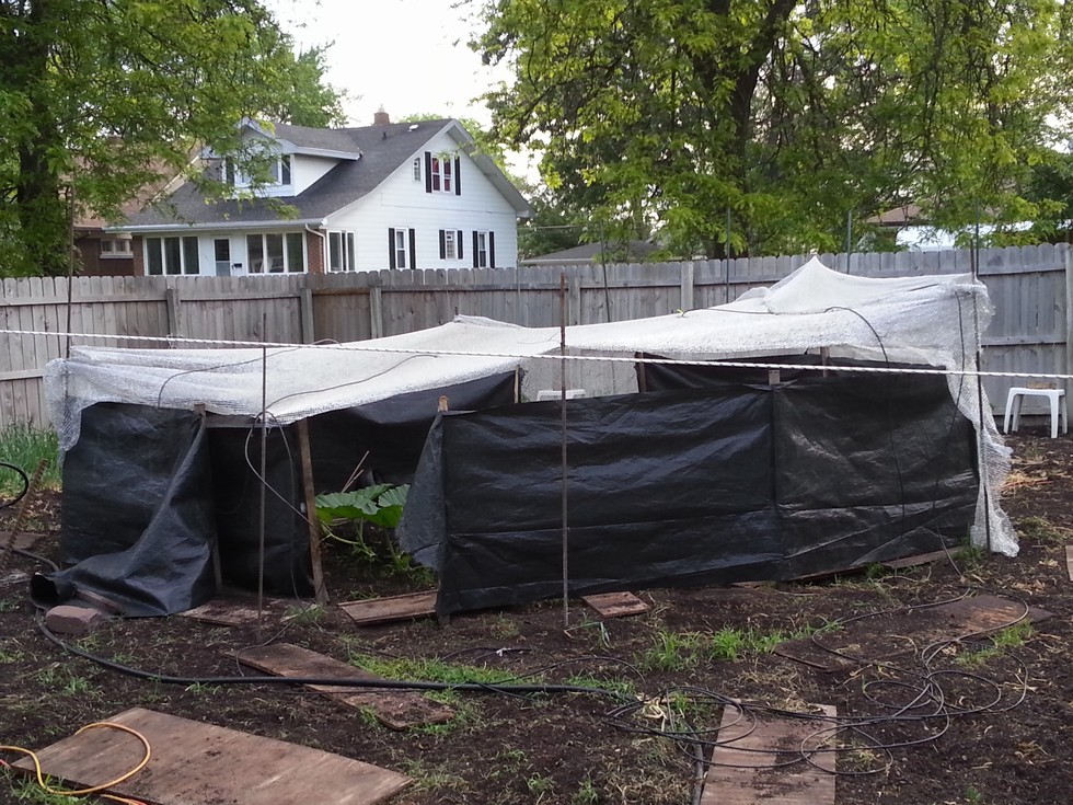 New digs for the 1546 and 1092 plants with 2 sections of tall silt fence with gaps for wind flow with a separate small section to close gaps on both side if high winds or storms. Along silt fence interior 2 fans blowing air in same direction with fans set perpendicular to fence. Shade cloth high enough on south side for better air flow between cloth and silt fence. 2 misting heads for each plant draped over shade cloth and secured set on timed intervals.