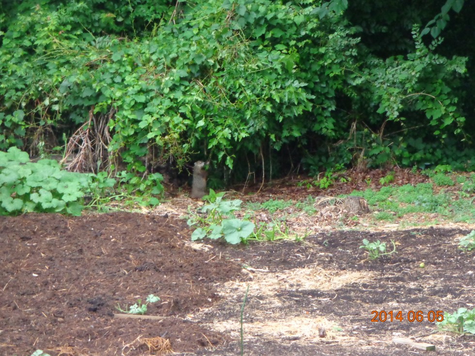 When I arrived home this evening the first thing I did was look to see if the trap had done me any good. It had not. So I started watching the garden area from a rear window of my home. Soon I saw leaves shaking on a squash plant and then saw the groundhog chomping away on the leaves. I watched him for about 20 minutes as he was at the time leaving my melon plants alone and mostly was eating leaves off plants on the edge of the woods that border my garden. I took a few pictures as I watched. I guess if I can shoot pictures of him then maybe I can shoot him with a air rifle. I went on Knoxville Craigslist and found one I hope to purchase. To be continued......