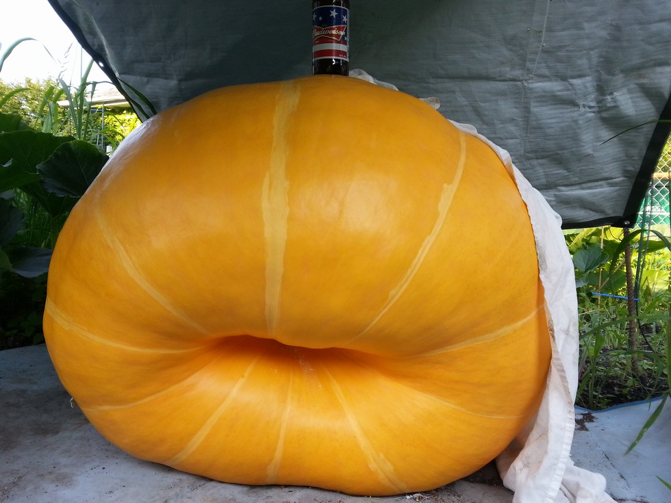 Bertha on the 679 day 30. the 679 is a 1495 x self means this one has a lot of the 1161 in it...lol.....sucked in blossom.....this one is more extreme than any i have grown and am curious to watch how she plays it out long term. i had to lay on my back with a knife in hand and reach into the area and delicately cut the prodruding blossom nub from pushing into the side wall of the pumpkin and treat it with captan. a good six pack gave me the steady nerve and confidence and all went well as can be seen in next pic.