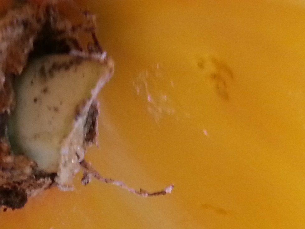 you can see to the right where the blossom nub was pushing into the side tilted and i cut her best i could without damaging the pumpkin or snapping the nub where it might fracture and split inwards. i love curve balls in this hobby and this one has my curiosity peaked. no record breaker as slowed down big time in cold spell but hoping to get her to 4 digits in one piece to the scale.