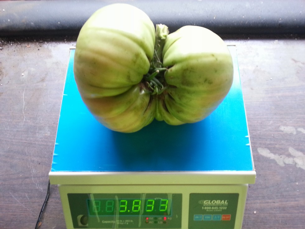 3.83 shenoha 2014 off the 6.57 Boudyo.....second heaviest tomato i have ever grown. i set the bar high for the first entry of the annual Bobbys Tap giant tomato contest. nice!!!