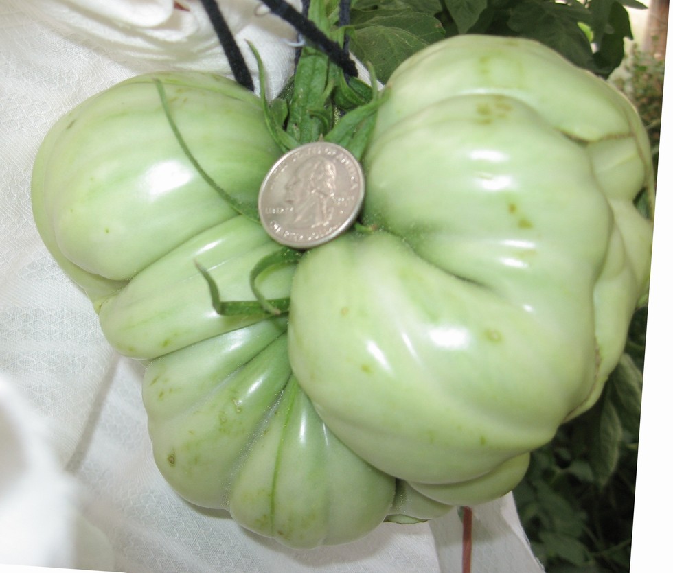 Several tomatoes are showing impressive growth, some are likely to top 2 lbs., yet none compare with this Michael's Portuguese Monster. It's trying desperately to keep up with the 8-pound-tomato growth rate formula and is still hanging in there, lagging a day or so behind. Estimated weight, at 21 days after fruit set, is 2.11 lb. - by far larger than anything I've had at this stage!