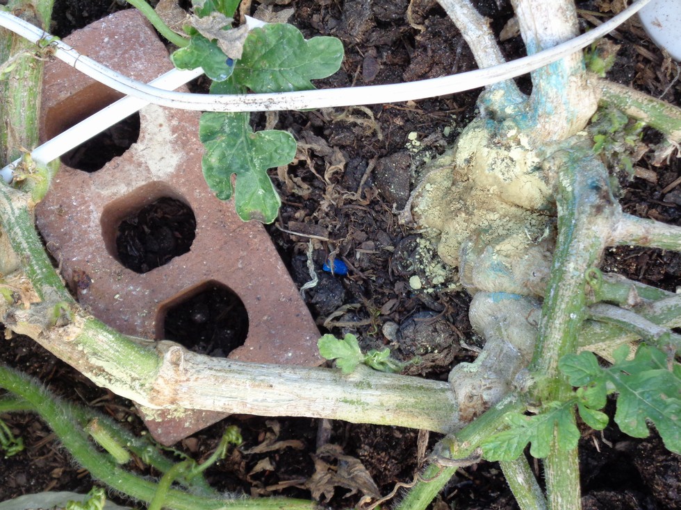 Here is a closeup of my fungicide covered stump. It is still leaking a bit but at this point I do not suspect GSB. The vine going over the brick is the one to the melon.