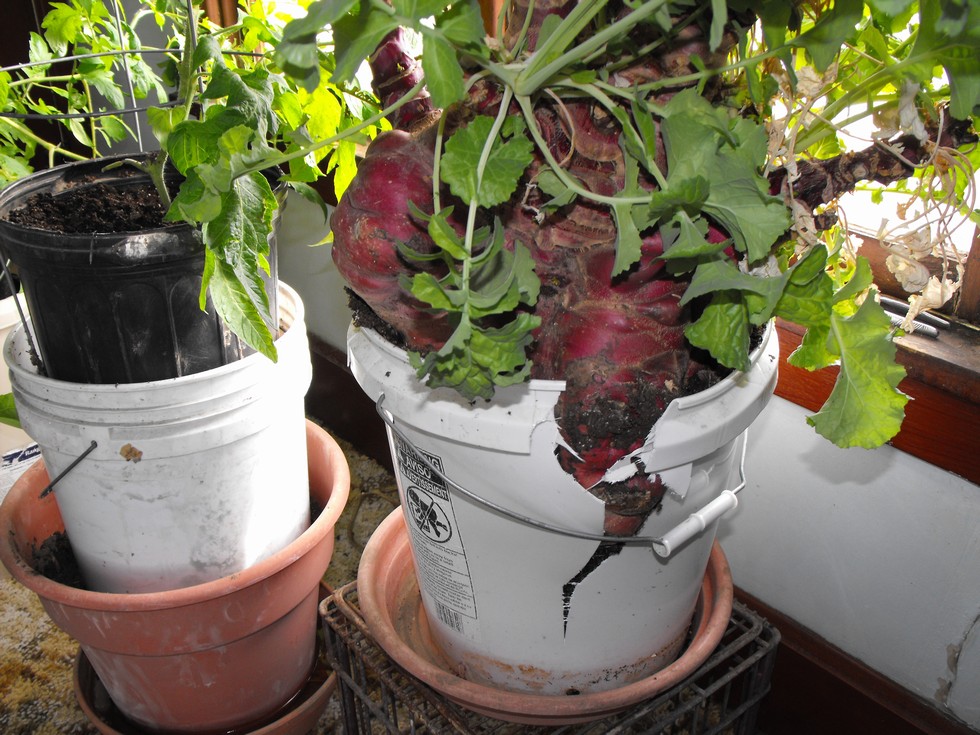 Here is how "NOT" to repot a 48 lb Rutabaga for seeding,lol. OOPS 5 gal bucket just not big enough,lol. Whats scary is, it isn't slowing down, only speeding up.lol. You can also see the stacked conainers in 3 stages. Thats what Mater the mater is planted in. I started him out in the lower redish large planter and worked up to the black 4 gal shrub container for massive root growth along the main vine, Hope it workes!! Also growing another very nice Mega on the tomato plant on the other side. Will post pics of that one in a couple days.