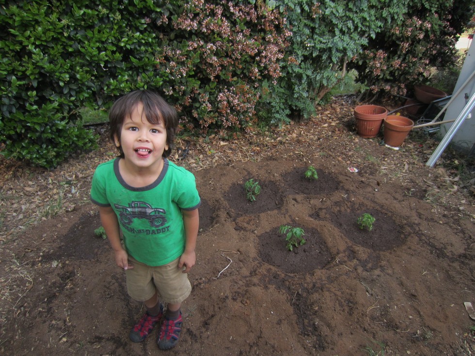 Joshua is excited, he has already named all 6 tomato plants. I picked up 6 organic plants from home depot, all different varieties. His names for the plants are as follows.