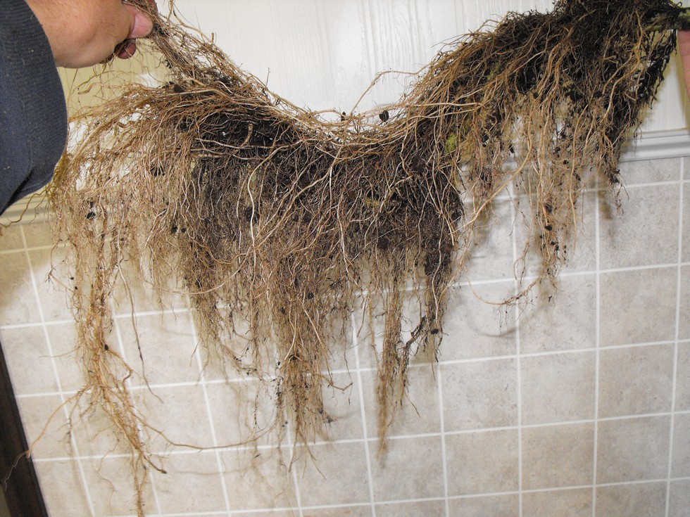 Here is a 24" upper in soil section of a 68" tall Steak House Tomato plant I grew this last winter in stacked buckets and planters. The root system was alot bigger than you see as most of it was tore up when I removed all the potting soil. There were big heavy roots all the way down in the bottom section as you will see in some other pics. I did not do anything special other than introduce worms and coffee grounds to the system with weekly watering. Did some simple pruning on this plant and produced a 2.68 pound Tasty Mater. The #2 plant I grew produced a nice 2.25 pounder, nothin special but a good experiment over the winter.