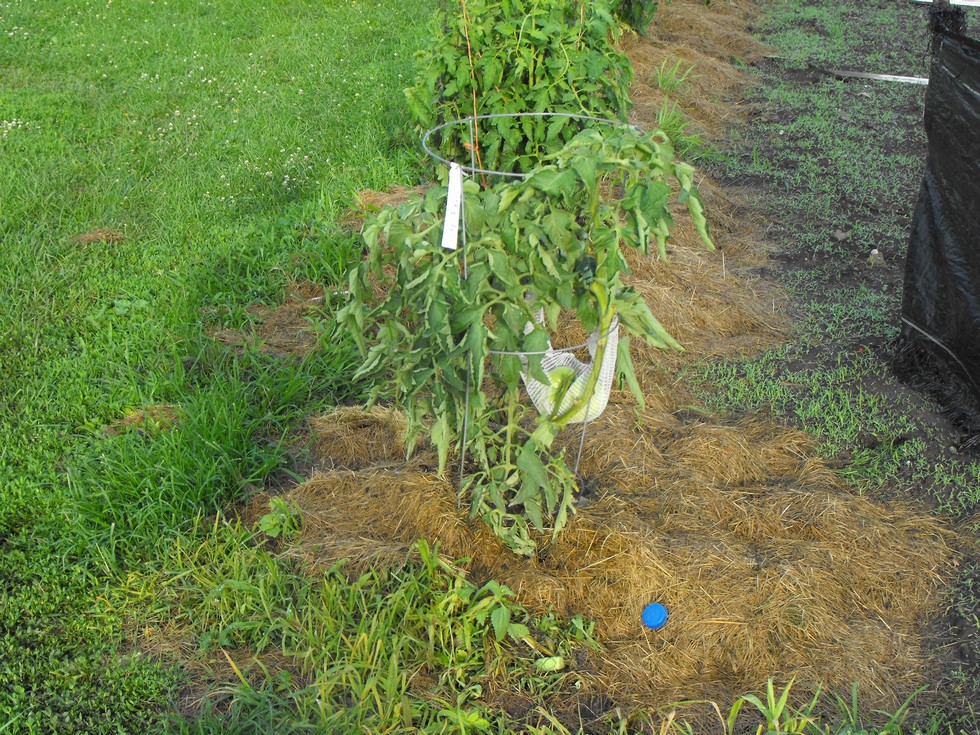 7.10 foss (A) Plant. It has takin me 4 years but I believe I have the pruning process working for me. This mater is putting on the weight. I have all of the leaf limbs(If you will) culled above the fruit on the same rising vine except the top leaves on that vine. It seems that all the juice is hiting the tomato first and the top leaves are suficing the single vine that the tomato is on. Just my theory. Them stem on the tomato is well over 1/2" thick now, see pic below. At 24" total plant length remember I laid the plants over and let the tip grow upwards for a about a week then buried thee entire lower section and half of the 12" up upwards vine growth for root mass!!