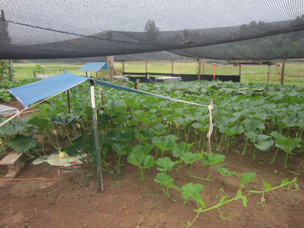 1969 X 1203 day 9. The 1969 hasn't slowed down and appears to like growing vine more than fruit right now. The 1969has been throwing really small females. The first set is a little slower growing than the others and maybe #2 or #3 set will show more early growth....or the plant will start to sinking @ #1 set soon by maturing and by ending vines. I also gave her a shot of P a few days ago so maybe this will help.