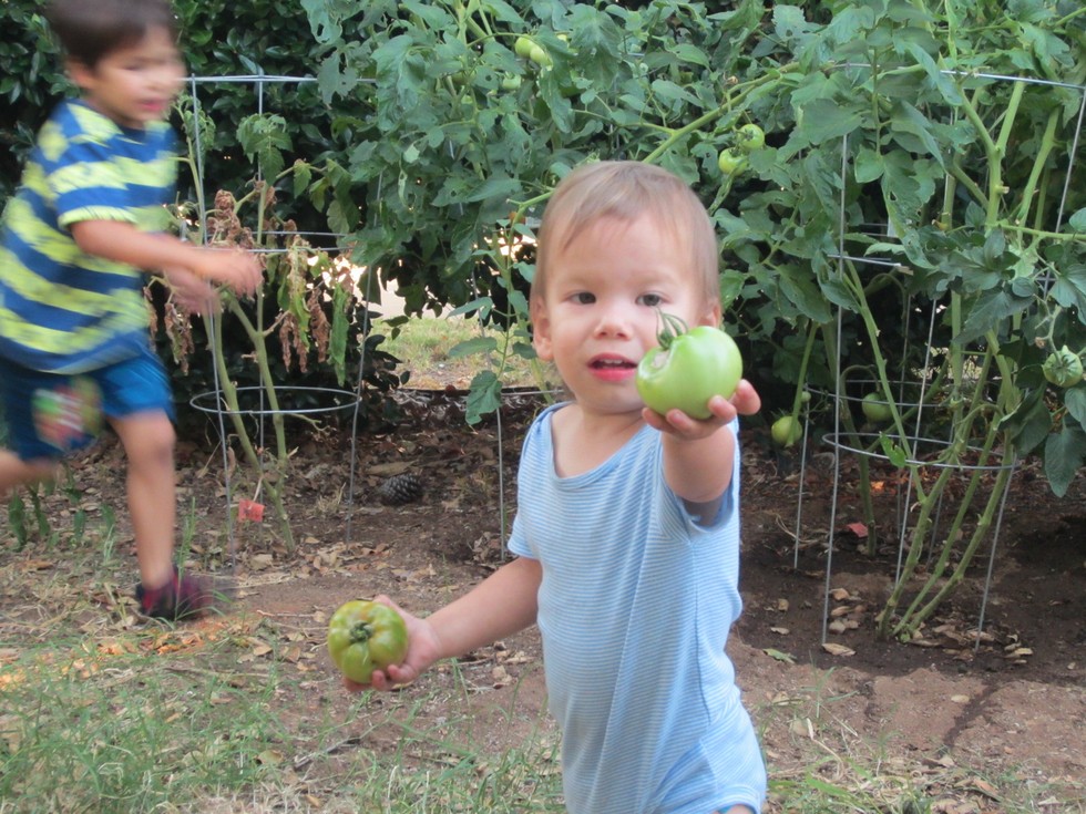 Andrew has become guite interested in our backyard maters. He sneaks into the plants and grabs a green tomato almost everyday! lol. I have lost quite a few maters!!! On the bright side, he LOVES the garden, even more than Joshua I think.