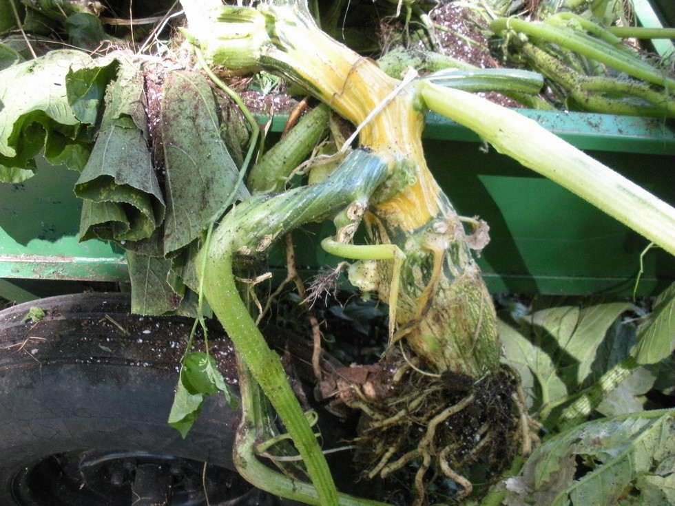 I thought this was interesting, this is the stump of the 1426 LaRiviere. After removal I noticed that the vine had a yellow and green color. In my experience, I usually see that with pumpkins that will have a nice orange color. My 1426 did not look like it was going to be orange it was a light colored fruit, but I am now wondering if it would have gotten some color later in the season.