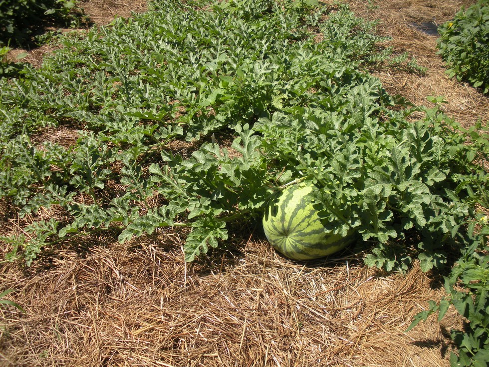 154 Sweet on a bushel gourd rootstock. This one is growing over hay and has no voles yet. It is a really fast grower, unfortunately it is growing on it's stem and the stem has split in two. I will just leave it and see how it does. I like how the later set plants perform for me. I seem to have less problems all the way around. Fast growing plants resist disease and insects so much better. The problem is I get so excited and impatient that I can't wait to start my seeds in the spring.